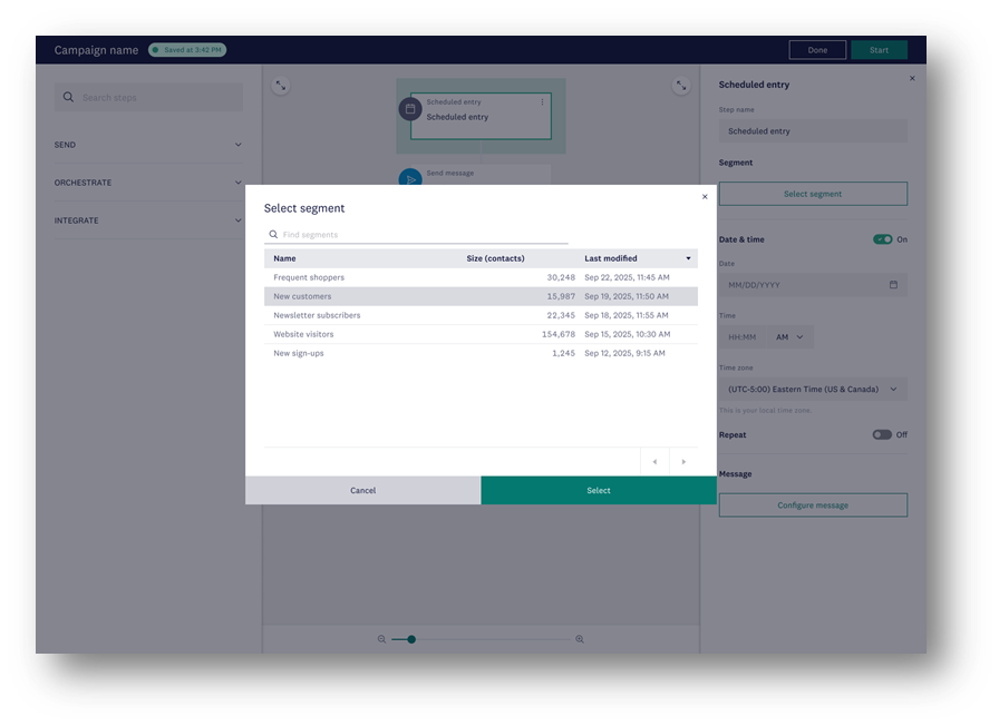 Launch multi-step lifecycle campaigns from a scheduled send, even when using a predefined segment as the entry point. This gives you more control to manage welcome, onboarding, and re-engagement journeys together, in a single campaign canvas. Learn more