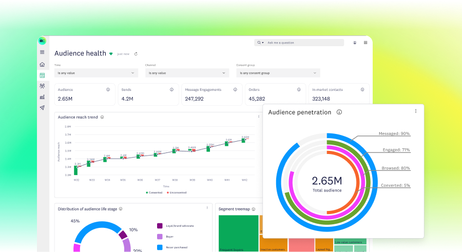Identify which consented groups drive results, which channels need attention, how message frequency may lead to fatigue, and how performance evolves over time — all from a single dashboard. Learn more
